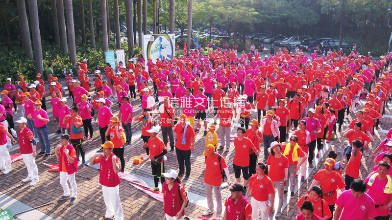 4)身著印有“雙璽時光道”運動服的隊員們進行健步走活動,聲勢浩大的隊伍吸引了公園晨練的人群視線;